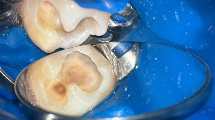 Пациентка обратилась в стоматологию «Профи-Дент» с жалобами на кратковременные боли от холодного в области нижней челюсти слева. При осмотре обнаружена кариозная полость на жевательной и щечной поверхности зуба 37.