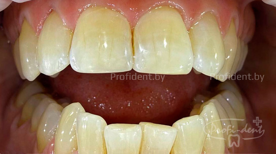 Пациент обратился в стоматологию «Профи-Дент» с желанием улучшить цвет и форму зубов. Основные эстетические проблемы: выраженная желтизна эмали и неровные, сглаженные режущие края передних зубов (верхних и нижних) из-за множественных мелких сколов. Это придавало улыбке неаккуратный вид и визуально добавляло возраст.