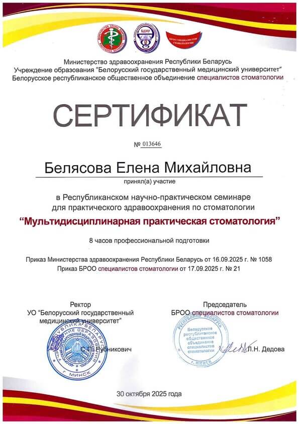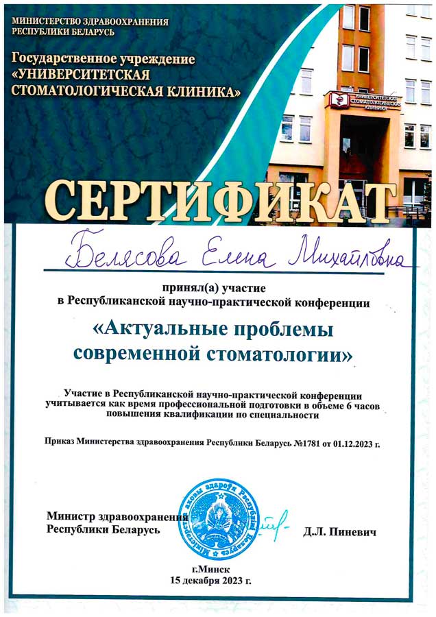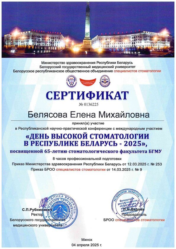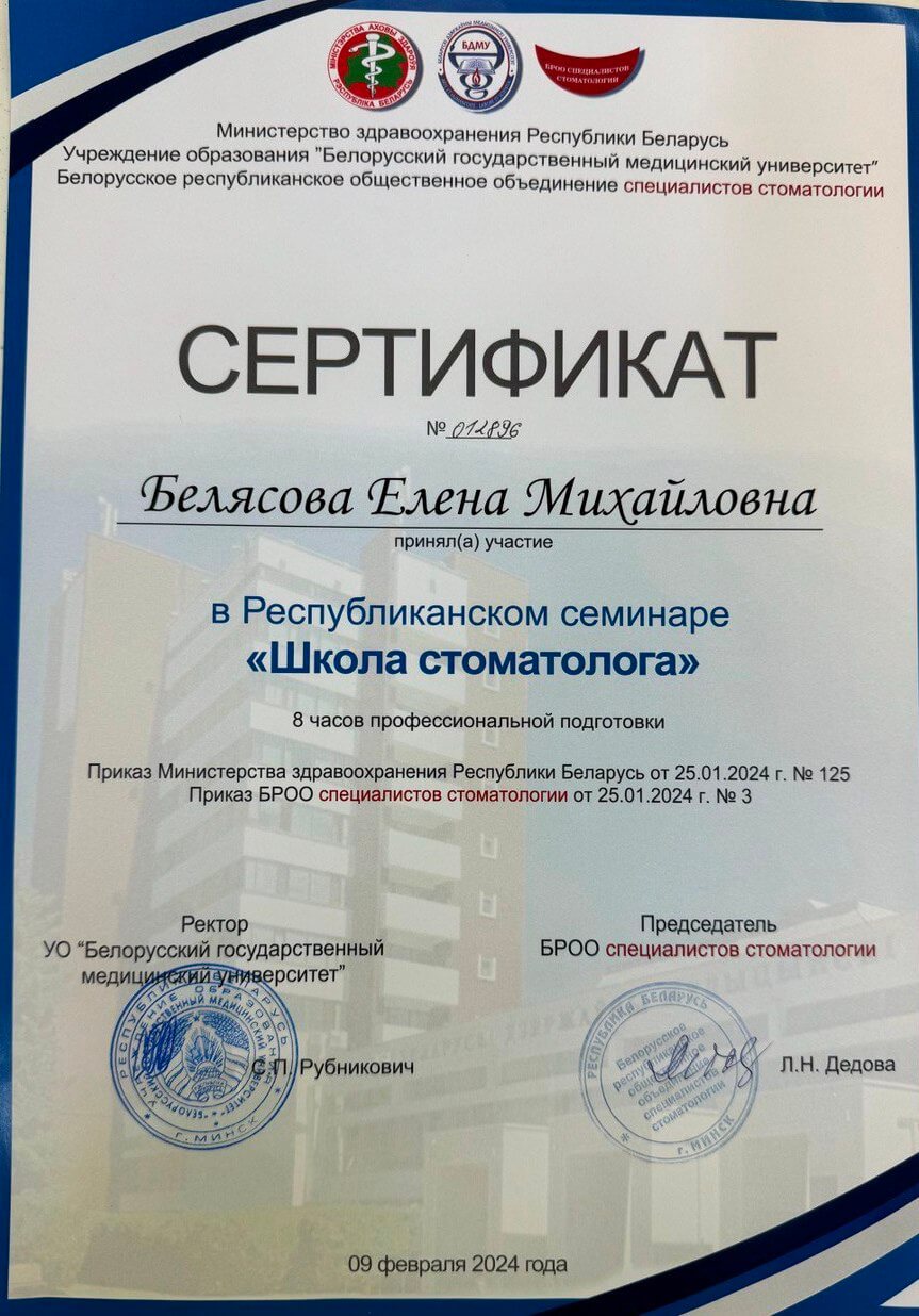 В 2005 году Елена Михайловна окончила стоматологический факультет БГМУ, в 2008 году – очную клиническую ординатуру на базе терапевтической кафедры Медицинского университета.