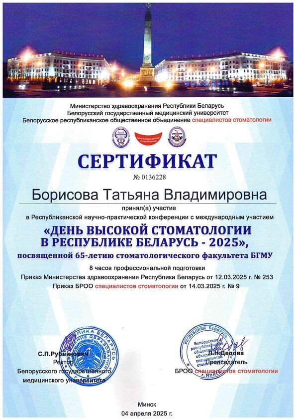 Здравствуйте! Меня зовут Борисова Татьяна, и я горжусь тем, что являюсь частью команды профессионалов в клинике «Профи-Дент». Моя работа — это не просто профессия, а истинное призвание, которое позволяет мне ежедневно дарить людям здоровье и улыбки. В стоматологии меня привлекает как наука, так и искусство, ведь каждая улыбка уникальна и требует индивидуального подхода. Моя цель — обеспечить вам комфортное и безболезненное лечение, при этом добиваясь превосходных эстетических результатов.