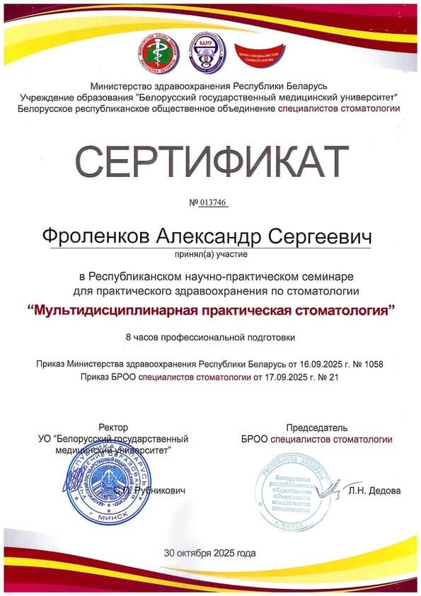 Огромная благодарность Фроленкову Александру Сергеевичу!!! За его суперпрофессионализм, качество работы, внимательное отношение к пациентам. Рекомендую обращаться всем пациентам. Человек с Большой буквы!