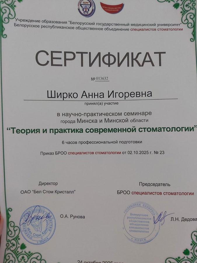 Хочу выразить свою огромную благодарность Ширко Анне Игоревне за качественно оказанные услуги. Это действительно профессионал в своем деле. Спасибо Вам за теплое отношение. Желаю Вам всего самого наилучшего и только благодарных пациентов.