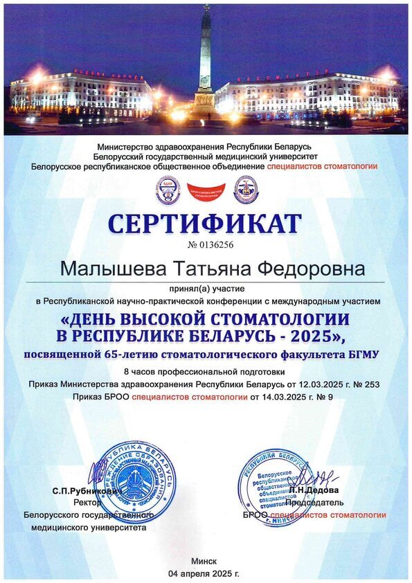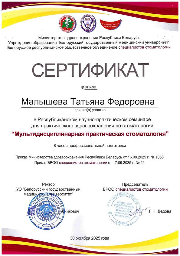 Регулярно принимает участие в стоматологических конференциях и мастер-классах. Является членом БРОО специалистов стоматологии.