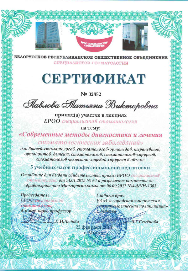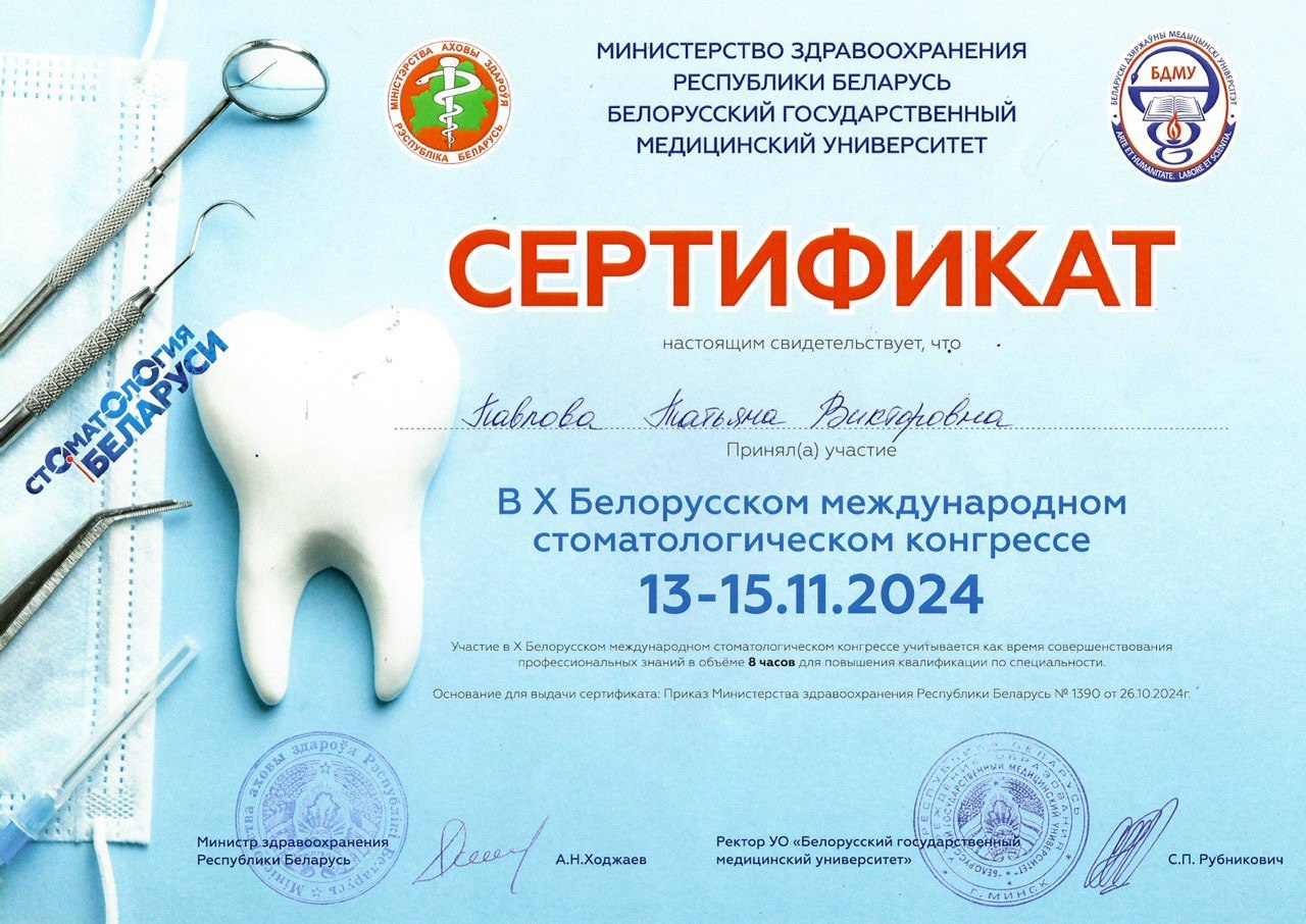 Закончила ординатуру 3-ей кафедры терапевтической стоматологии БГМУ.