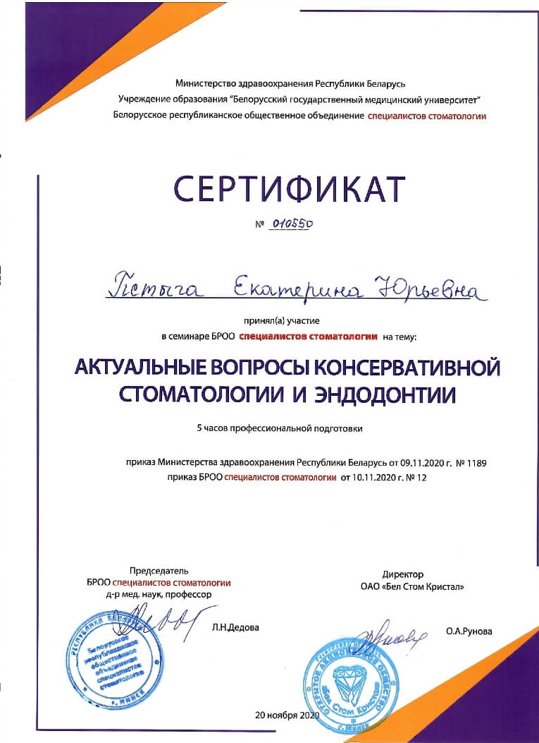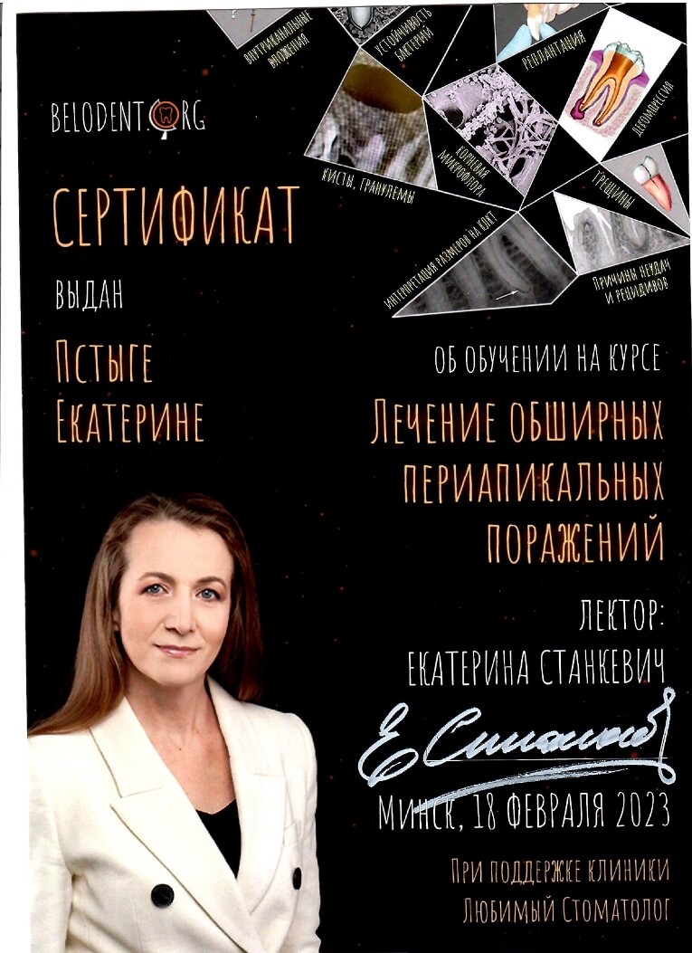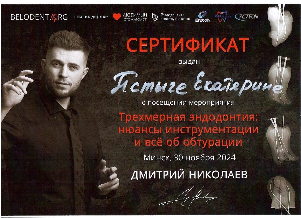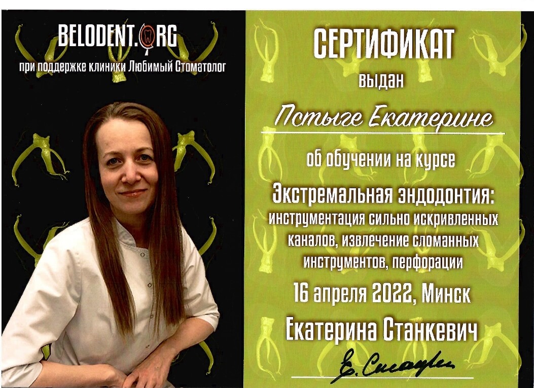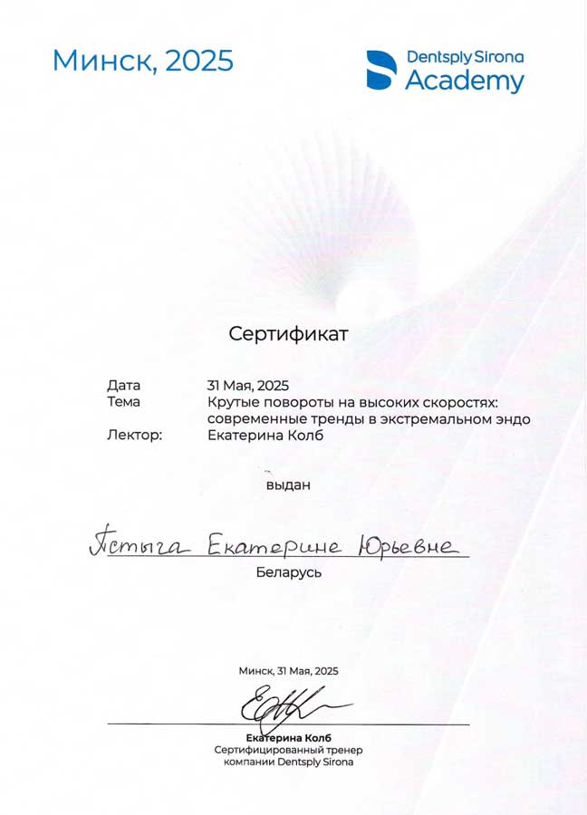 Специализируется на сложном эндодоническом лечении корневых каналов под микроскопом. Владеет новейшими технологиями в данной области, постоянно совершенствуя свои навыки и знания, принимая участие в научно-практических конференциях, симпозиумах и мастер-классах как в Республике Беларусь, так и за рубежом.