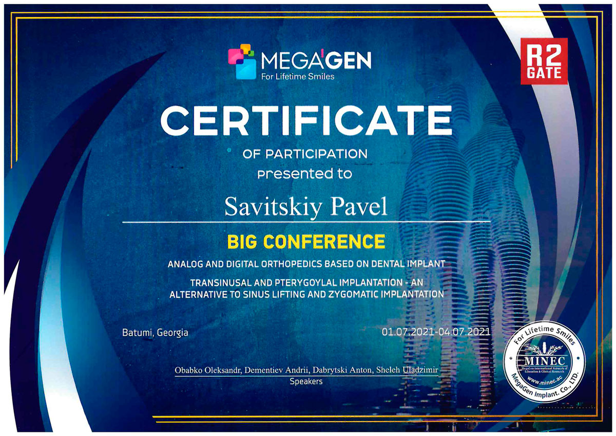 - 2021 г., «Analog and orthopedics based on dental implant / Transinusal and pterygoylal implantation – an alternative to sinus lifting and zygomatic implantation» Батуми. Грузия