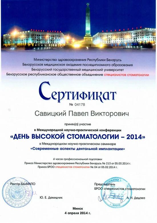 - 2014 г., Принял участие в Международной научно-практической конференции «День высокой стоматологии-2014» и семинаре «Современные аспекты дентальной имплантации»